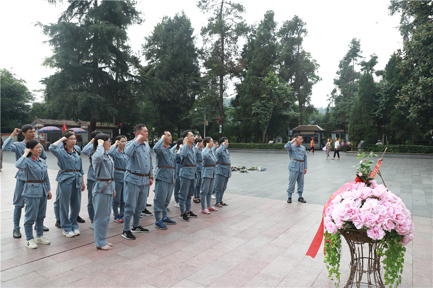 紅軍山烈士陵園青松翠柏環(huán)抱、莊嚴肅穆,拾級而上,廣場中央高聳矗立的紀念碑上題寫著“紅軍烈士永垂不朽”八個金色大字。在烈士紀念碑前,蔣華書記帶領(lǐng)全體黨員唱紅歌、重溫入黨宣誓。隨后,黨員們還瞻仰了烈士紀念碑史實浮雕、“鄧萍烈士之墓”。