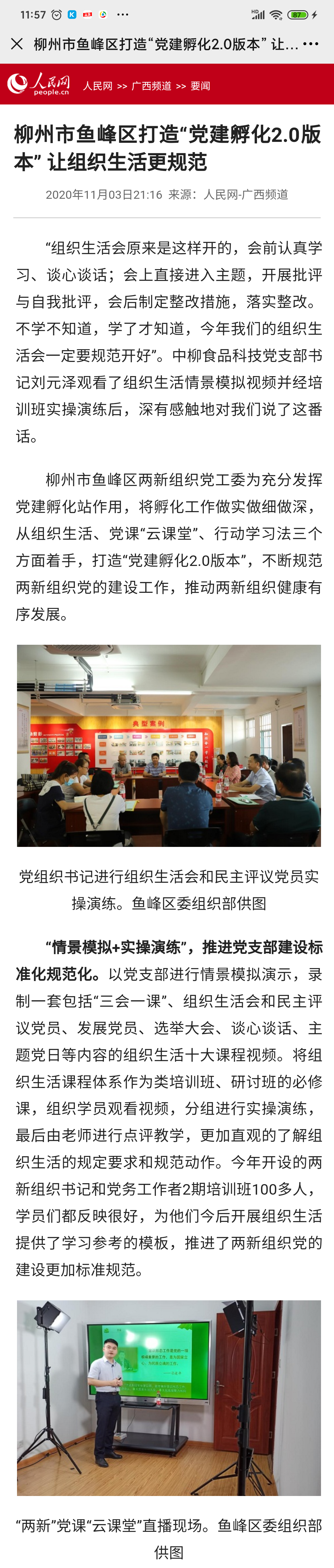 近日,人民網(wǎng)廣西頻道以《柳州市魚峰區(qū)打造“黨建孵化2.0版本” 讓組織生活更規(guī)范》為題對魚峰區(qū)兩新組織黨建孵化站進行了報道。