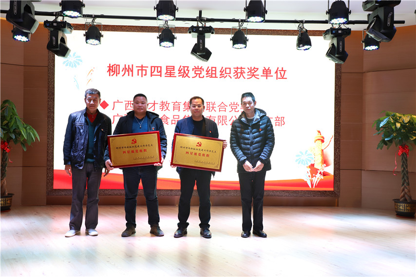 ▲集團(tuán)黨委書(shū)記蔣華(右二)領(lǐng)取柳州市“四星級(jí)黨組織”榮譽(yù)獎(jiǎng)牌