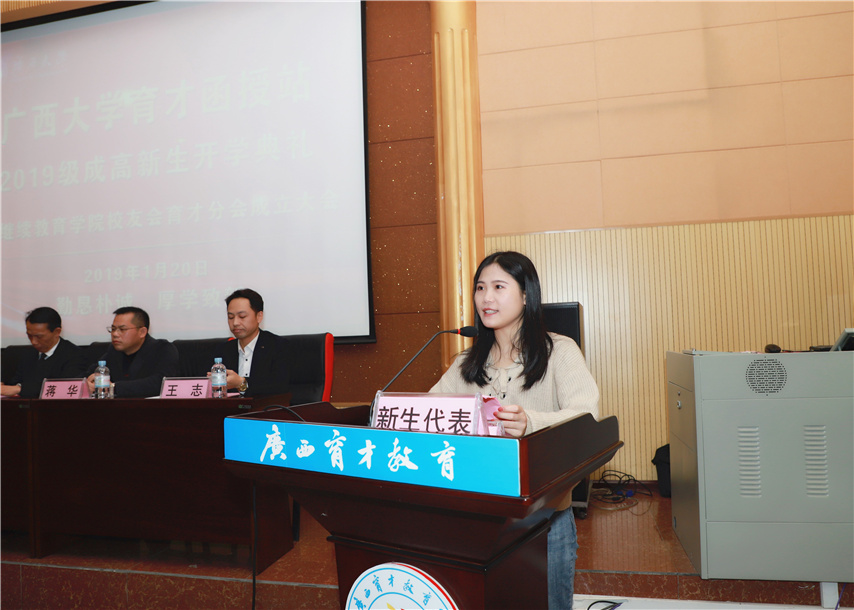 2019級法學專業(yè)本科班的葉詩夏作為新生代表發(fā)言,她說,成人高等教育是人生中一次重要的選擇,而廣西大學嚴謹求實的學風和校風,讓人向往,學校擁有優(yōu)質(zhì)的教學資源,有助于提高自己的專業(yè)知識水平和綜合能力,希望希望可以與同學們一起學以致用,報效社會,為母校爭光添彩。