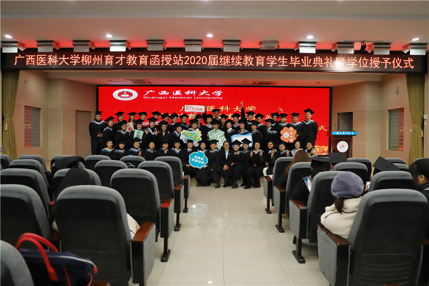1月11日下午,廣西醫(yī)科大學柳州育才教育函授站2020屆成高畢業(yè)典禮暨學位授予儀式在柳州市人民醫(yī)院第一學術(shù)報告廳隆重舉行。廣西醫(yī)科大學繼續(xù)教育學院院長、廣西醫(yī)科大學學位評定委員會委員、主任醫(yī)師趙邦教授、副院長劉慶委、李春燕,院辦主任黃明、教務科科長馮政毅、招生工作與學生管理科科長韋先良,集團聯(lián)合黨委書記、董事長、函授站站長蔣華以及來自柳州醫(yī)藥系統(tǒng)畢業(yè)生代表參加了畢業(yè)典禮,典禮由集團聯(lián)合黨委副書記、副站長王志主持。